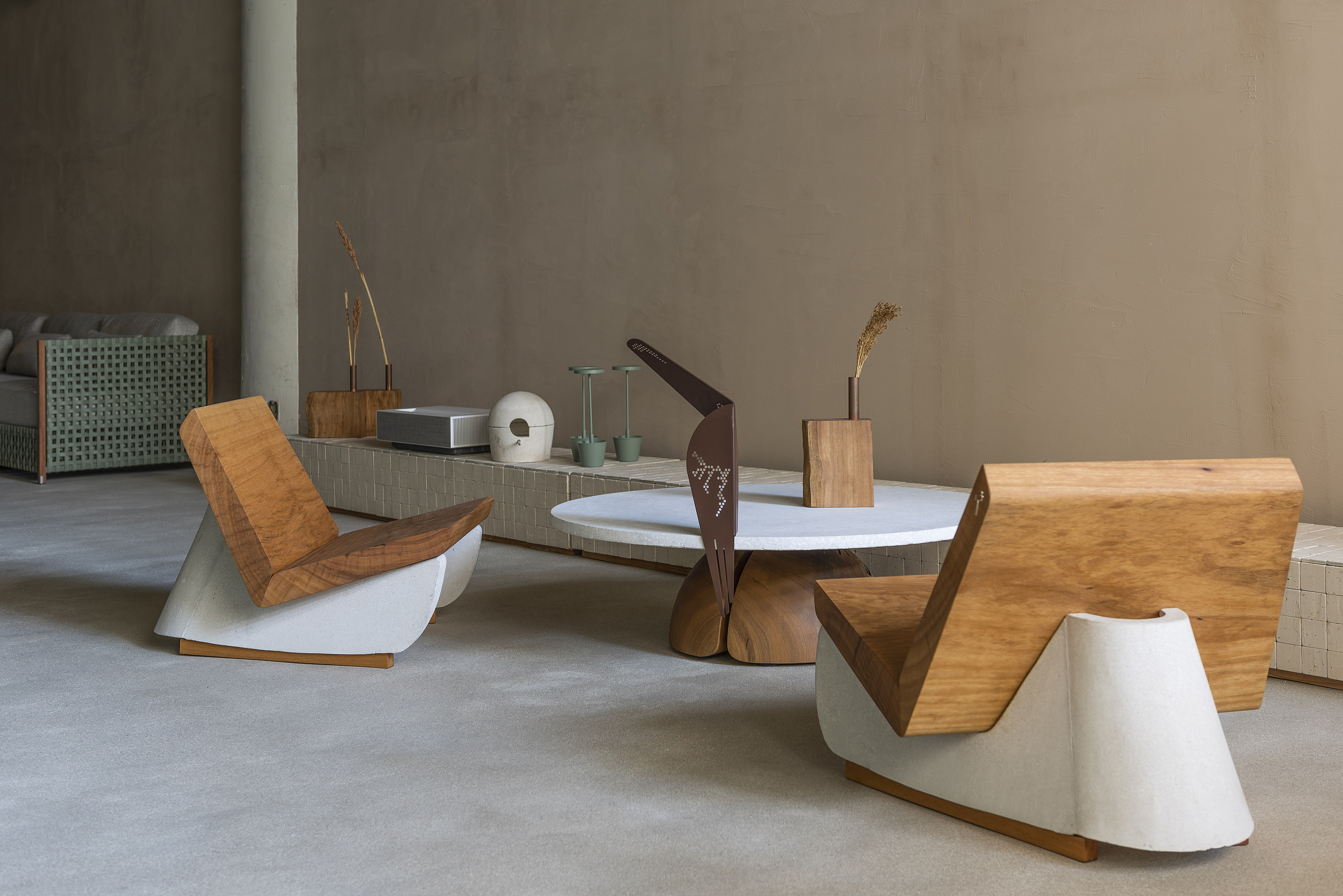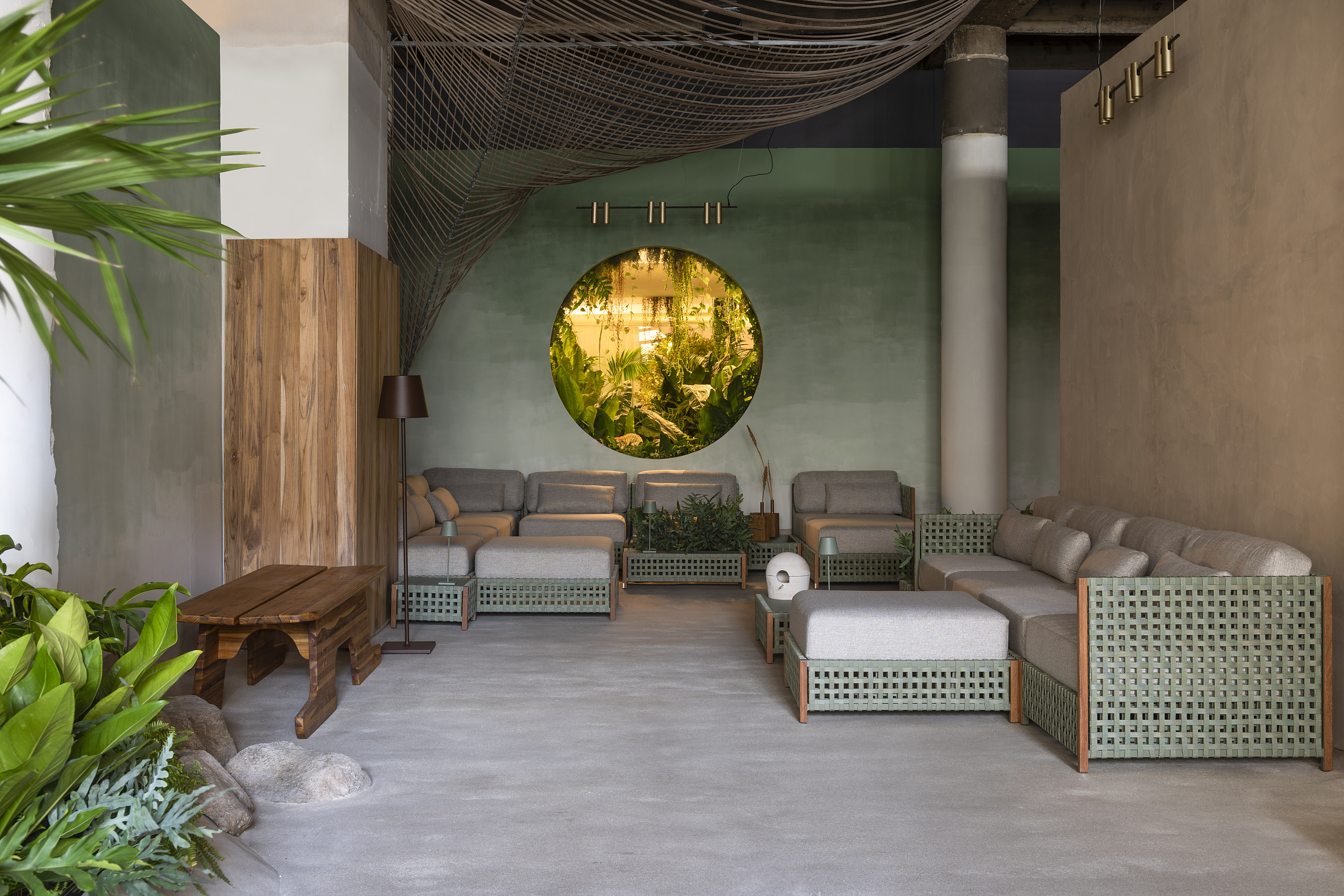 A vegetação tropical estrutura a ambiência e reforça a sensação de refúgio, enquanto lounges com mobiliários autorais do estúdio convidam à permanência e ao encontro.